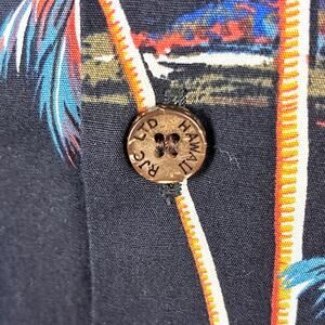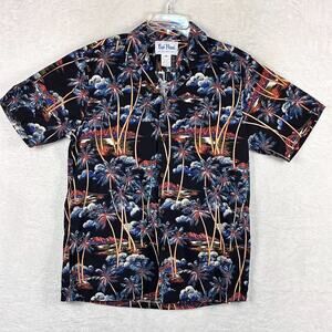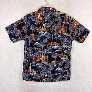 VTG Kai Nani Hawaiian Shirt Mens M Black Blue Palms AOP Beach Tropical Aloha USA