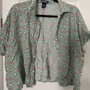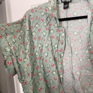 Hot Topic short sleeve button-up shirt in a pastel green frog and mushroom allover print. Lightweight rayon fabric. Size M. Perfect for Y2K, kawaii, cottagecore, or alt aesthetic lovers. Gently worn, no flaws.