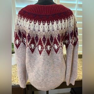 Gorgeous Express sweater featuring a cozy Fair Isle pattern in rich burgundy, cream, mauve, and metallic gold threading. Soft, medium-weight knit with subtle shimmer and textured detailing around the neckline and chest. Perfect for the holidays or a winter night out!