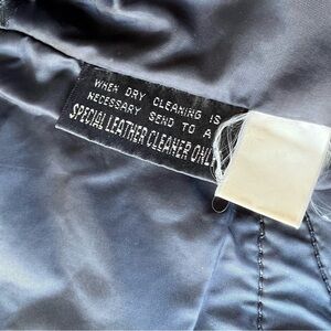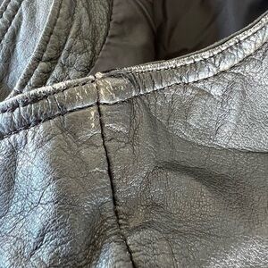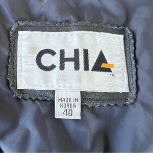Vintage 80s CHIA Distressed Leather Biker Vest-Men’s Size 40 (Medium). Black leather with a large Harley Davidson Eagle Wing patch across the back. Button front closure, pointed front hem, lined. Good preowned condition with all-over obvious distressing to the leather and patch. The buttons are loose and the bottom button is missing. There is a small hole on the inside liner. Made in Korea. Tagged size 40. See measurements for best fit.