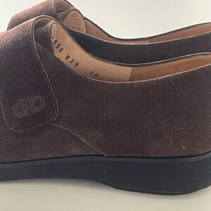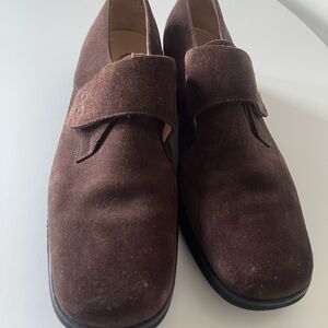 Vintage Ferragamo slip-on loafers in rich chocolate suede with strap detail and low block heel. Leather lining/sole. Made in Italy. Preowned—scuffs to suede, insole logo wear, normal outsole wear (see photos). Comfortable, minimalist classic.