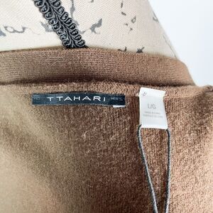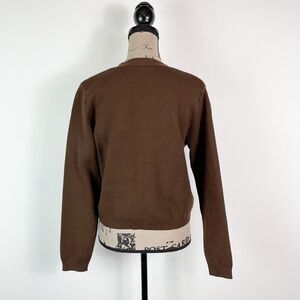 Elegant brown cardigan with button front. Features two chest pockets. Perfect for layering.