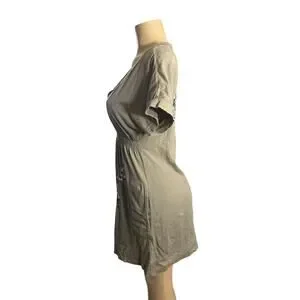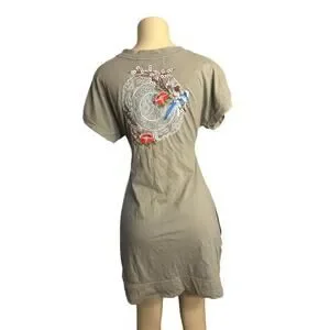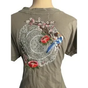 Women M Johnny Was JWLA V-Neck Embroidered Floral Bird Green Cotton Tunic Dress