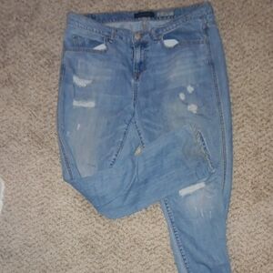 Trendy light blue skinny jeans with distressed details. Ideal for casual outings.