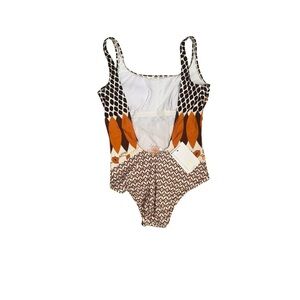 This chic swimwear features a striking black and orange design, perfect for fun days at the pool or beach.