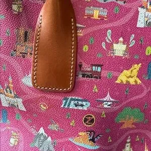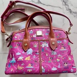Dooney x Disney Park Life bag collection released in January 2020 and is no longer made. This bag lets you take your Disney memories with you everywhere you go. It’s a unique design, in that the print shows park icons and rides from Disneyland, Walt Disney World, and Disney California Adventure. So many favorites are represented: Pixar ball, Matterhorn, Sleeping Beauty Castle, Cinderella Castle, Space Mountain, Pirates of the Caribbean, Dumbo, Fantasmic, Tree of Life, and more.