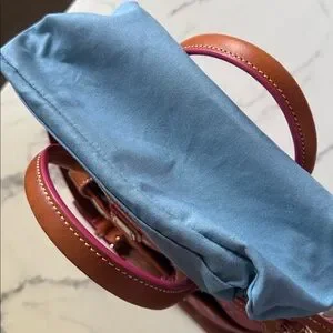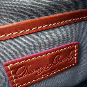 It features stitched leather trim, brass hardware, and blue cotton lining.