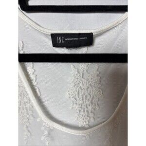 The INC Women's White Floral Embroidered Mesh Top is a Boho Dainty Cottagecore Fairy blouse perfect for a casual occasion. With a sleeveless design, round neckline, and pullover closure, this top is made of lightweight polyester and nylon mesh fabric. The white floral embroidery adds a colorful touch to the sheer and stretchy top, making it a stylish choice for the summer and spring seasons. Hand wash only to maintain its quality, this top by INC International Concepts is a must-have addition to any woman's wardrobe.