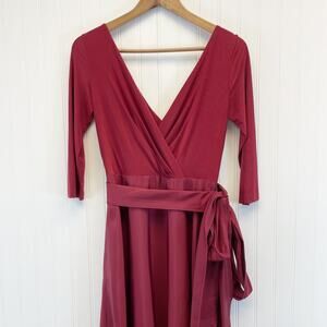 -Features: jersey stretch surplice bodice, elegantly draped skirt with luxe sash, floor length A-line skirt