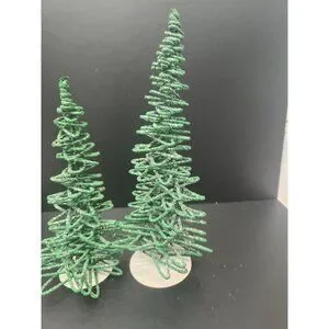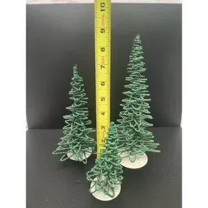 Enhance your holiday village display with this set of three vintage Dept 56 frosted zig-zag trees. Retired and collectible, these green trees add a festive touch to any scene, perfect for capturing the spirit of the season.