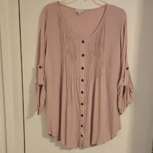 Elegant blush blouse with button-front. Features pleated design and rolled sleeves. Perfect for any occasion.