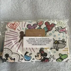 Disney Dooney & Bourke Sketch pattern wallet. New with tags. Circa 2015. Vibrant wallet with playful Disney character designs. Dumbo, Mickey and Minnie on front.