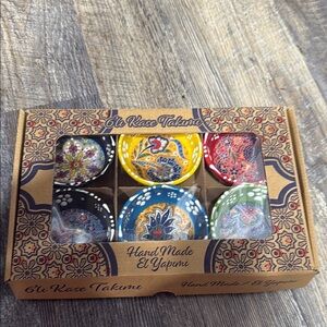 Set of six vibrant ceramic bowls. Features intricate patterns in black, yellow, red, blue, and green.