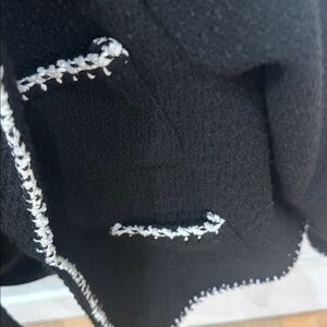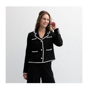 Sophisticated black jacket with elegant white trim. Perfect for versatile styling.