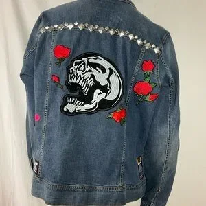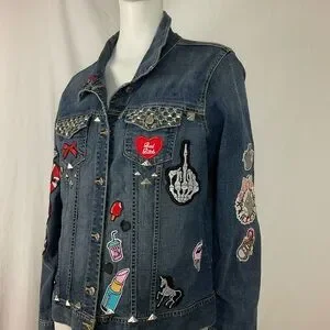Embellished Patchwork Beaded Denim Jean Jacket. Upcycled Old Navy Jean Jacket with Various Patchwork and Silver diamond shape Studs. WomenSize XXL.