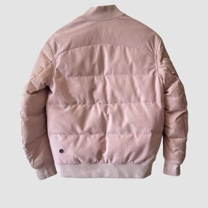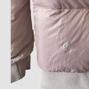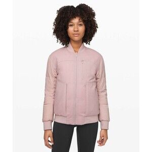This Lululemon Jacket is a perfect addition to your wardrobe. It is a Roam Far Wool Bomber Jacket that comes in a beautiful pink color. The jacket has a zipper closure and is made of wool with a goose down fill. It is a 3-in-1 jacket that can be reversed and is perfect for casual occasions.