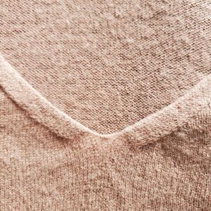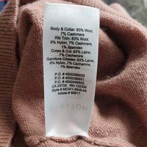 Features ribbed hems and sleeves and is very soft. It's made of 93% wool and 7% cashmere (see the material tag for details of material content of other areas of the sweater). It's lightweight and perfect for the spring.