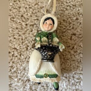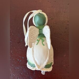 It is a vintage collectible! Elegant angel ornament in green and white, perfect for adding a touch of grace to your holiday decor.