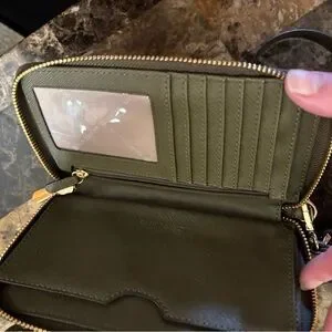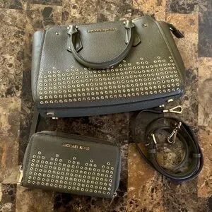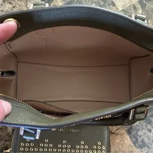 Stylish Michael Kors satchel/crossbody with matching wallet. Features gold studs on dark olive green leather. Ideal for fashion-forward looks. EUC