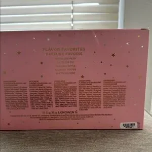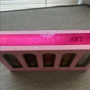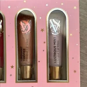 This stunning lip balm and gloss set from Victoria's Secret features a beautiful array of pink and purple shades, perfect for creating a gradient effect on your lips. The sleek cylindrical tubes are elegantly packaged in a soft pink box, showcasing the vibrant colors that range from light to deep tones.