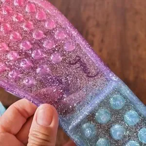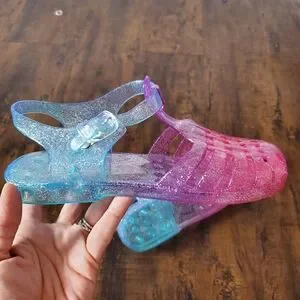 These sparkly jelly shoes for kids feature a fun blend of pink and blue colors. Perfect for adding a touch of glitter to any outfit.