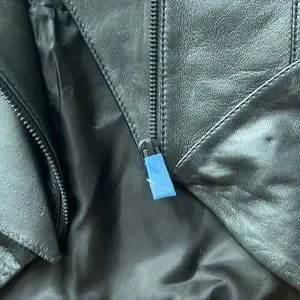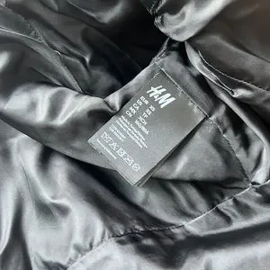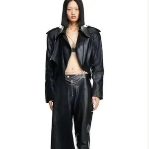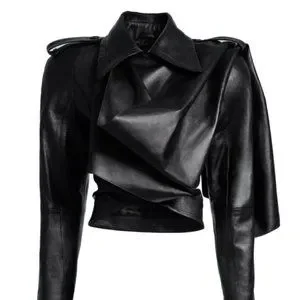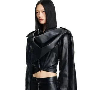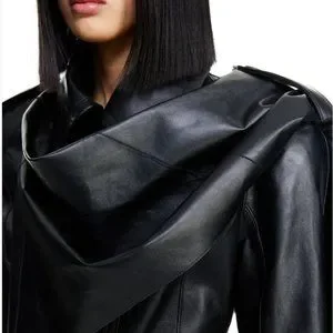 H&M. Crop jacket in soft leather with a wide, attached scarf to wrap around body for a glamorous look. Exaggerated shoulder pads and shaped waist form a dramatic hourglass silhouette. Collar, shoulder tabs with button, and a diagonal zipper at front with concealed snap fastener at top. Welt inner pocket with button. Buttons engraved with designer’s logo. Crafted from chrome-free leather. Lined.