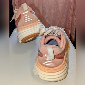 Stylish Hoka sneakers. Features pink upper with cream sole. Comfortable and trendy.