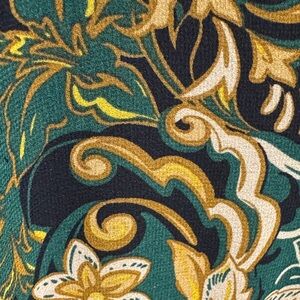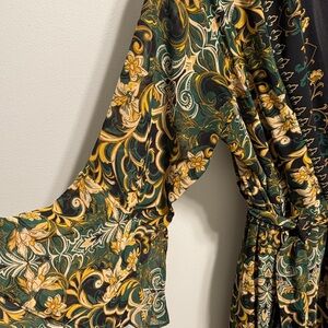Elegant maxi dress with a floral pattern. Features black, green, and gold colors. V neck, elastic waist, full bell sleeves. Worn once EUC