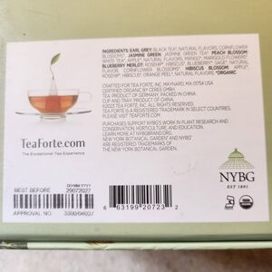 Indulge in a luxurious tea experience with this Tea gift Set. This elegant set features A steeping pot in a beautiful soft green and five assorted teas. Earl gray, Peach blossom, hibiscus blossom, Jasmine green, and blueberry Merlot. this is new in package, expiration date is July of 2027.