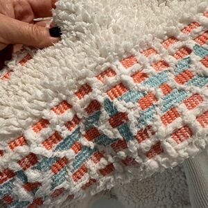 Soft ivory teddy jacket with zip front. Features orange and blue geometric patterns on shoulders and sleeves. Ideal for layering.