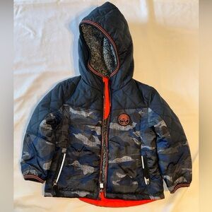 Keep your little guy warm and stylish with this cozy Gerry puffer jacket! 🧥 This blue and black camo jacket is built for cold days, featuring a warm sherpa-lined hood, soft quilted body, and bright orange details that pop.