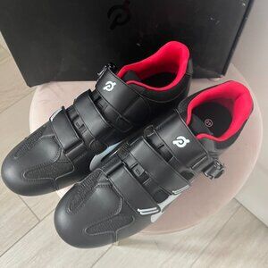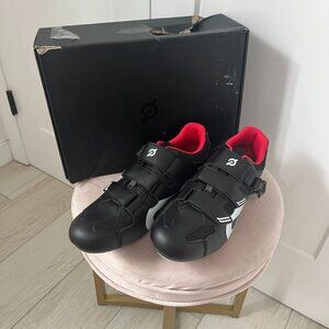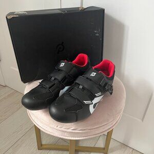 Peloton Cycling Shoes Size 45. Includes original box with tools to set up and instructions. Black with white and red detailing/logo. Peloton size 45, which is equivalent to a men's size 11.