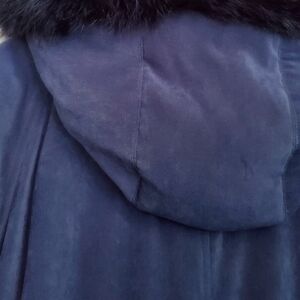 Stay warm and stylish with this elegant blue coat with the real fox fur trimmed hood. With the suede like fabric the coat is long, very warm and perfect for chilly days. Its classic design ensures you look chic and feel comfortable.