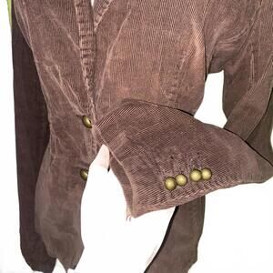 Soft chocolate-brown corduroy blazer with a true Y2K vibe—shapely, cinched waist and sculpted seams that flatter, subtle scalloped front hem, and antique-brass buttons at the front and cuffs. Medium-wale corduroy gives it that cozy fall texture; structured yet comfy for layering over tees or slip dresses. Perfect for cottagecore looks, campus outfits, or a polished 2000s throwback with jeans and boots. Like new perfect condition.