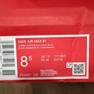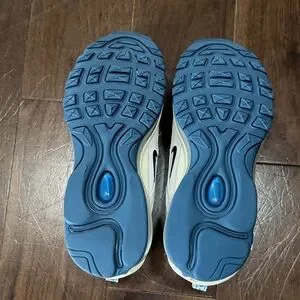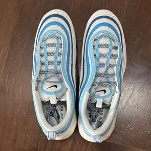 Stylish Nike Air Max 97 with blue and white design. Features iconic swoosh and comfortable cushioning.
