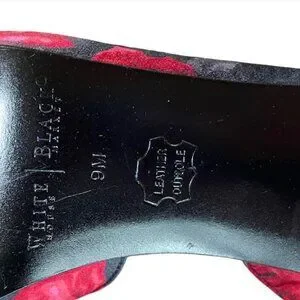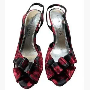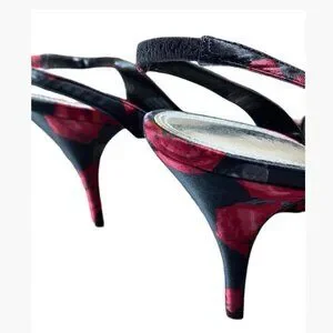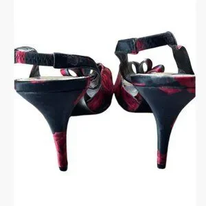 These like-new WHBM high-heel slingbacks sport a beautiful black and red floral motif. You'll enjoy the furled bows and leg-lengthening high-heeled shoes that pair perfectly with dressy, special occasion, and holiday outfits.