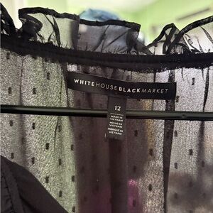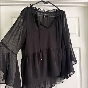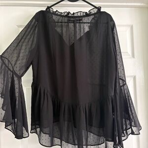 Elegant sheer black blouse. Features ruffled neckline and flared sleeves. Perfect for any occasion.