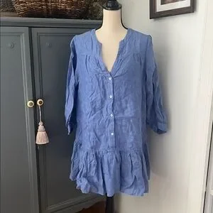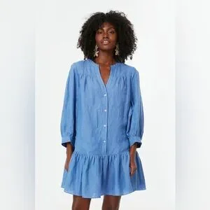 The femininity and flirtiness of a drop waist combined with the versatility of an allover chambray colorway creates the perfect mini- meet the Lake Blue Frankie Dress. This linen stunner makes for the perfect elevated resort wear with its notched neckline, button front placket, and twirl worthy hem. Get ready for your moment in the sun and pack this lightweight number with you for your next trip- add sandals and a tote for a good time no matter where the day takes you!