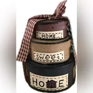 Charming stacked boxes with 'Home Sweet Home' design. Features brown, tan, and black colors. Perfect for rustic decor.