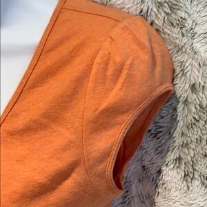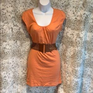 This top is amazing! The perfect length to wear with leggings or skinny jeans! Pair with a belt and booties, maybe a Jean jacket to keep warm and it’s the perfect fall top! The back cut out is too cute and loving the cap sleeves! There is a shimmer throughout the neckline and around the lining of the back cut out. Some piling thought it but no visible stains. Color is peach (a light orangey pink) Belt not included