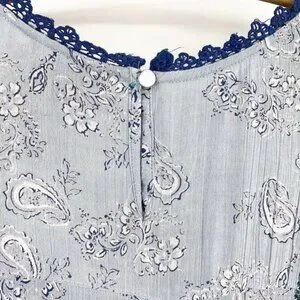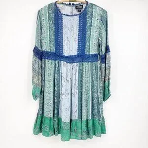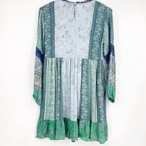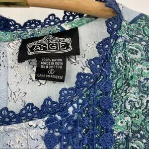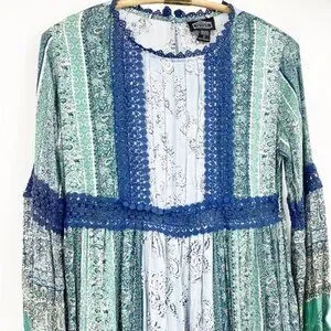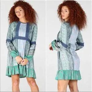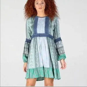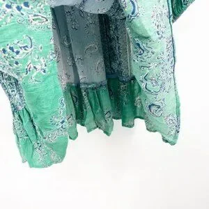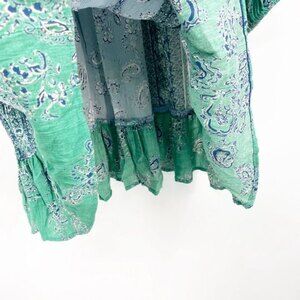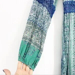 Angie Blue and Green Parsley Print w Balloon Sleeves & Lace detail S