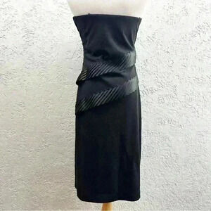 Vintage Victoria Royal Black fitted strapless dress size 6. Dress has pleated satin ribbon across the front and back. The bust has lining on the inside with some boning for structure. Has a side slit and side hidden zipper. Has stress. Dress a little loose on the mannequin. Use provided approximate measurements for accuracy: