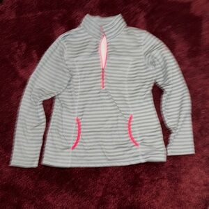 The first is a gray and pink striped pullover with a half-zip design. The 2nd is a mauve color.