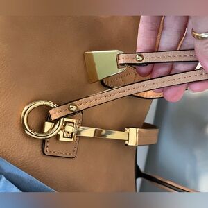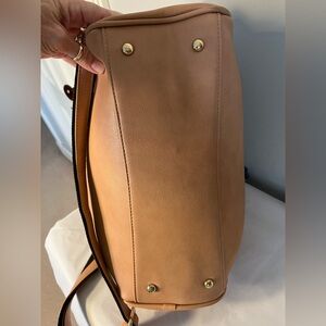 Excellent condition, light peach colored huge bag! This is a vegan bag, no wear noted. 1 small mark as shown in photo. Inside clean and no odors! It’s a really big bag, too big for me. 17 X 12 X 4 , 3 compartments, hold everything, even the kitchen sink.