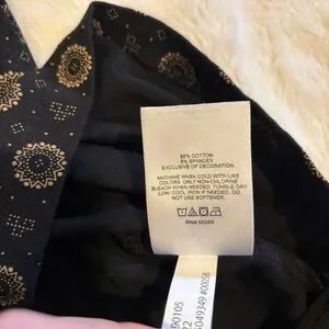 Black with tan geometric mandala print, 95% cotton, 5% spandex, soft and stretchy, not see-through, classic collar and two buttons polo design