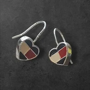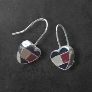 Vintage Heart Mosaic Enamel Earrings Red, Black, Cream French Hoop Slight Dangle