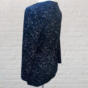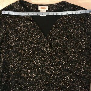This flattering Talbots wrap style blouse/top features a striking floral or naturalistic pattern set against a black background. The top additionally features 3/4 sleeves, and wraps around, tying on the side or front, creating that V-neckline. When the top wraps, it creates that fitted silhouette, offering that classic look that is perfect for both casual and business casual events. The sleeves have an approximate 1 1/2” slit, allowing them to be cuffed or turned up if desired.