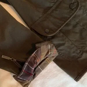 Classic Barbour barn jacket in deep olive/bark green. Features flap pockets and button front and fully lined complimenting plaid interior. Rugged style with durable waxed cotton fabric designed to handle the weather. Roomy enough to wear over sweaters. Zip sleeve detail (roll them up to expose the lining!)
