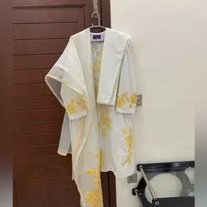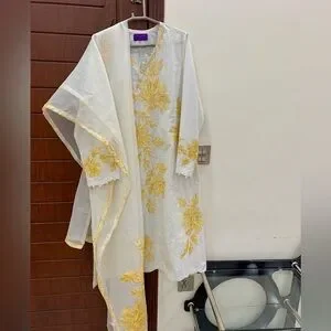 Elegant white dress with yellow floral embroidery. Comes with a matching scarf by Pakistani designer SANA SAFINAZ