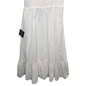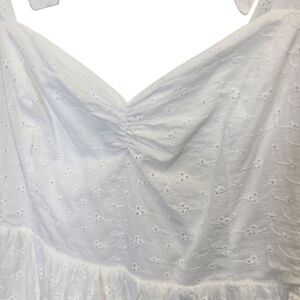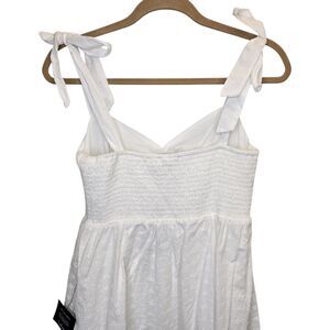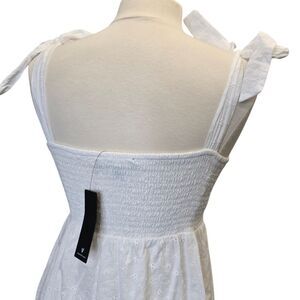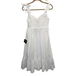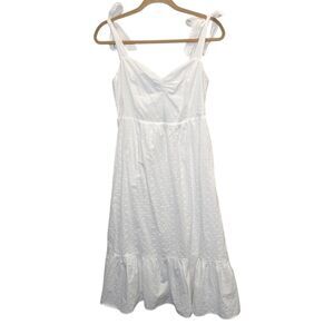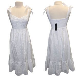 NWT Lulus Women's M Fairytale Feeling White Eyelet Tie-Strap Tiered Midi Dress. Crisp woven cotton with eyelet embroidery. Romantic midi dress, featuring wide tank straps that tie at the shoulder, a ruched sweetheart neckline, and a fitted bodice. High waist falls to a tiered midi skirt. Smocked panel at back for fit. Shell: 100% cotton. Lining: 100% rayon.